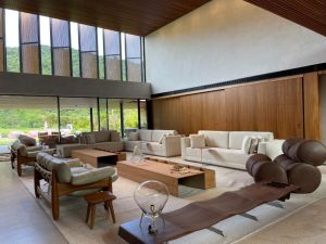 A arquiteta e design de interiores Leila Dionizios foi a escolhida para a missão de unir o estilo clean e moderno de Belle com os toques de brasilidade que um refúgio praiano pede. “Exploramos materiais naturais, alinhados com peças icônicas do mobiliário brasileiro. Um exemplo dessa mistura está na sala de jantar, que tem a mesa Fifity do designer Guilherme Torres, feita exclusivamente para este projeto. A luminária Kuripaco, do Sergio Matos, que mistura regionalismo e design, foi usada para dar o toque brasileiro”, comenta Leila.